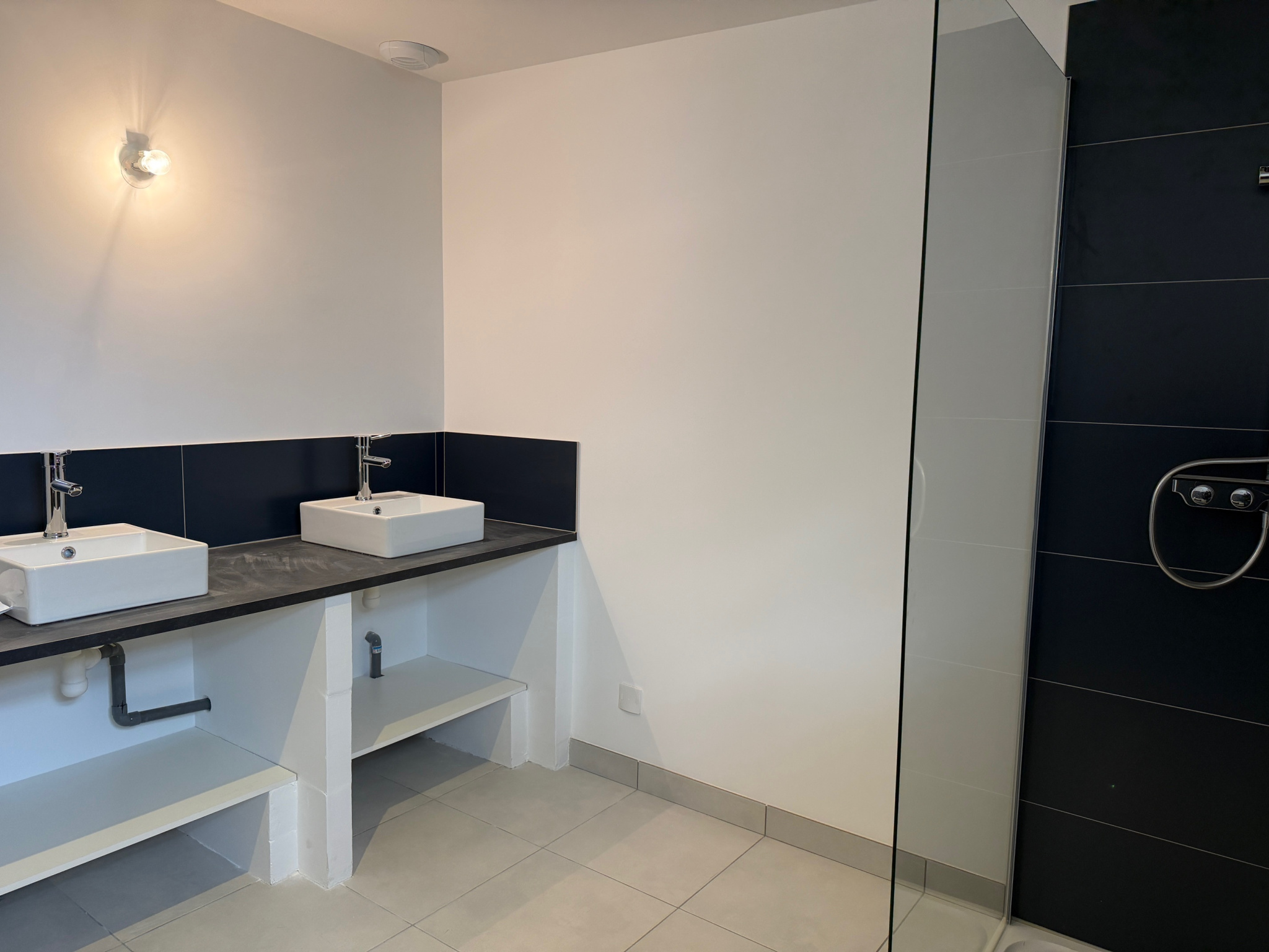 Il se compose d’une entrée avec wc et lave-mains, ainsi qu’un placard de rangement, d’une grande pièce de vie lumineuse ouverte sur une cuisine aménagée et équipée (posée courant avril), de trois chambres avec placards (dont une avec salle d’eau privative), et d’une salle de bains avec douche et baignoire.