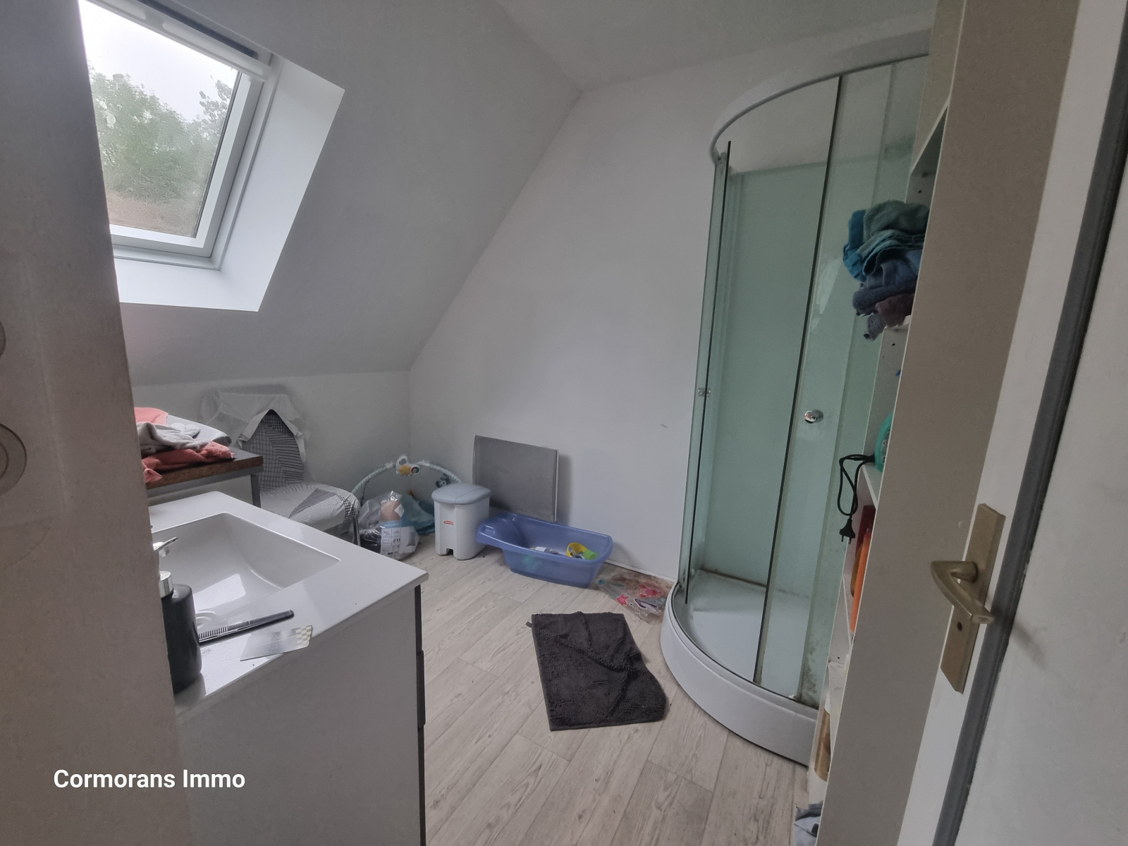 Elle comprend au RDC : hall d'entrée, une cuisine aménagée et équipée, un beau salon/séjour, une pièce à terminer pouvant servir de chambre, un wc.