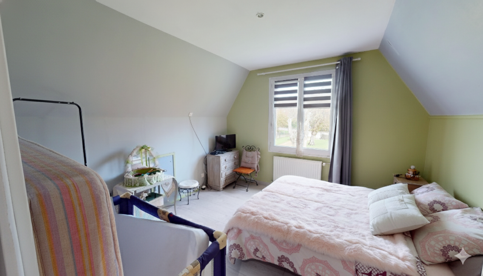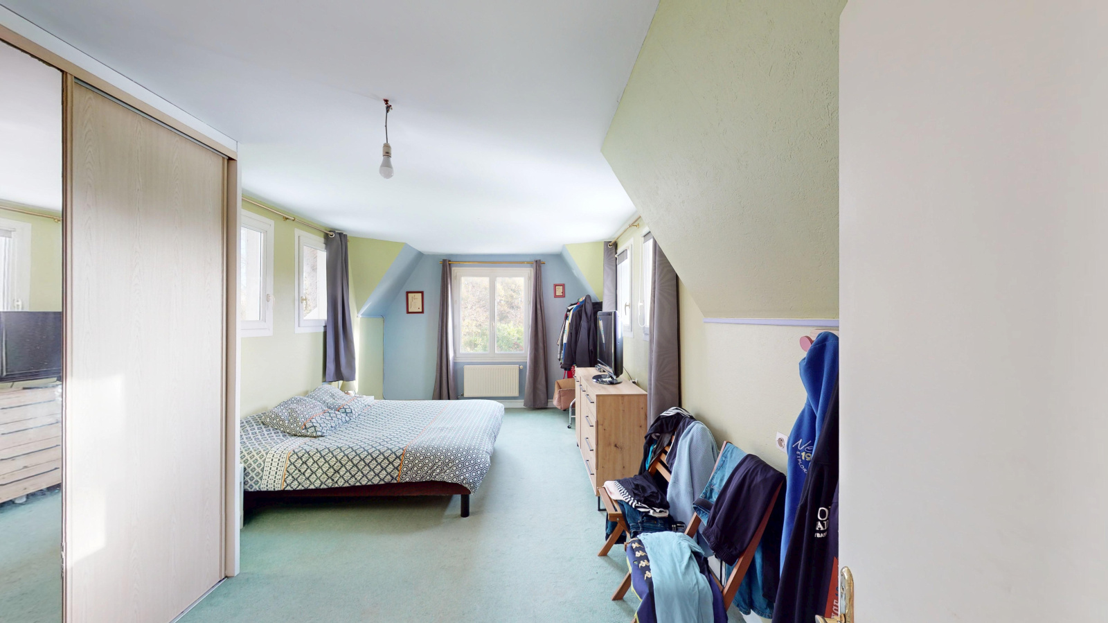 À l’étage, un palier dessert trois chambres spacieuses, dont une particulièrement généreuse, ainsi qu’une salle d’eau moderne avec WC.