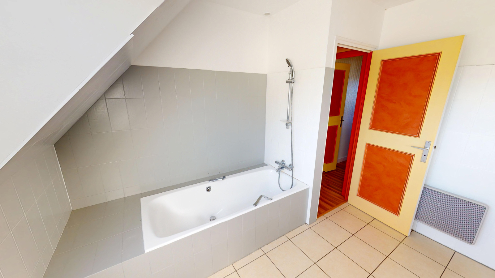 À l’étage, un couloir dessert trois belles chambres, une salle de bains, un WC séparé et un placard/dressing astucieux — idéal pour une organisation optimale au quotidien. Vous disposerez également d’un sous-sol complet comprenant un garage avec porte électrique pouvant accueillir deux véhicules et une buanderie. L’accès piéton à la maison se fait par une allée gravillonnée située à l’avant, menant directement à la porte d’entrée ; côté nord, une allée bitumée permet d’accéder facilement au stationnement et au garage en sous-sol, ainsi que de garer deux véhicules supplémentaires.