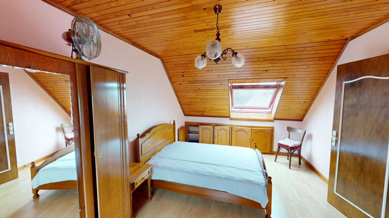 A l'étage : un palier dessert une grande chambre traversante, 2 chambres plus petites et une salle d'eau avec wc.