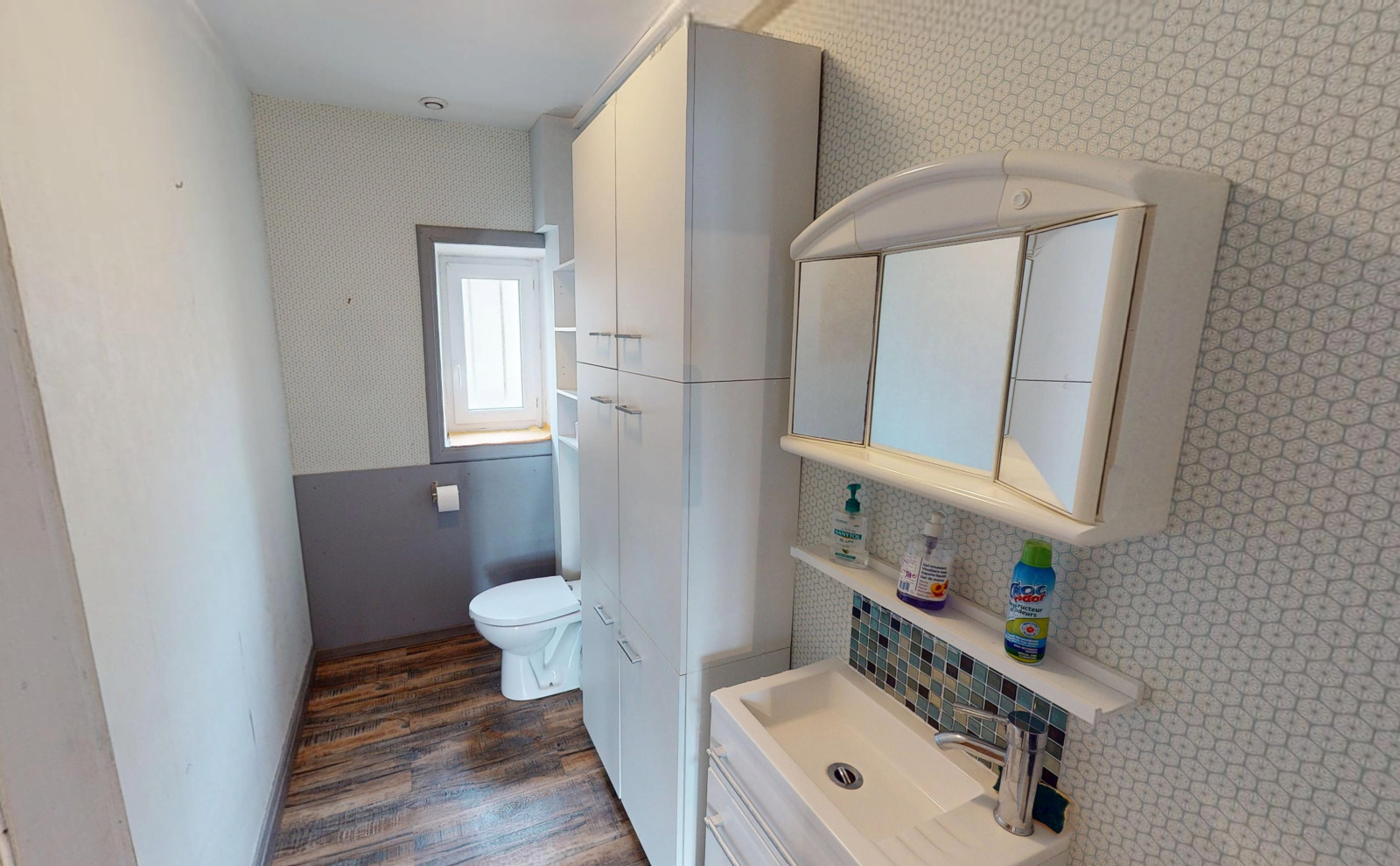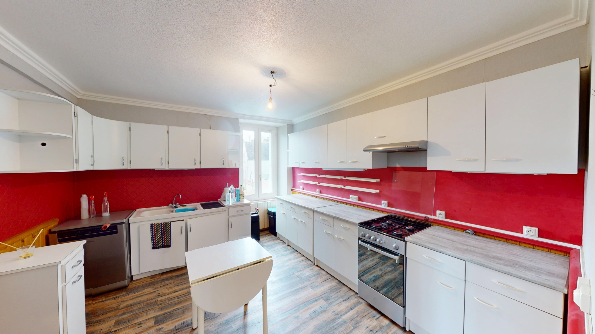 Au 1er étage (accessible par un escalier extérieur ou par un escalier intérieur) : sas d'entrée avec placard, hall d'entrée avec rangement sous l'escalier, cuisine dînatoire aménagée et équipée ouverte sur la salle à manger et le salon, conduit de cheminée à re-tuber et possibilité d'y installer un poêle; un cabinet de toilettes avec un wc + lave-mains et placards.
