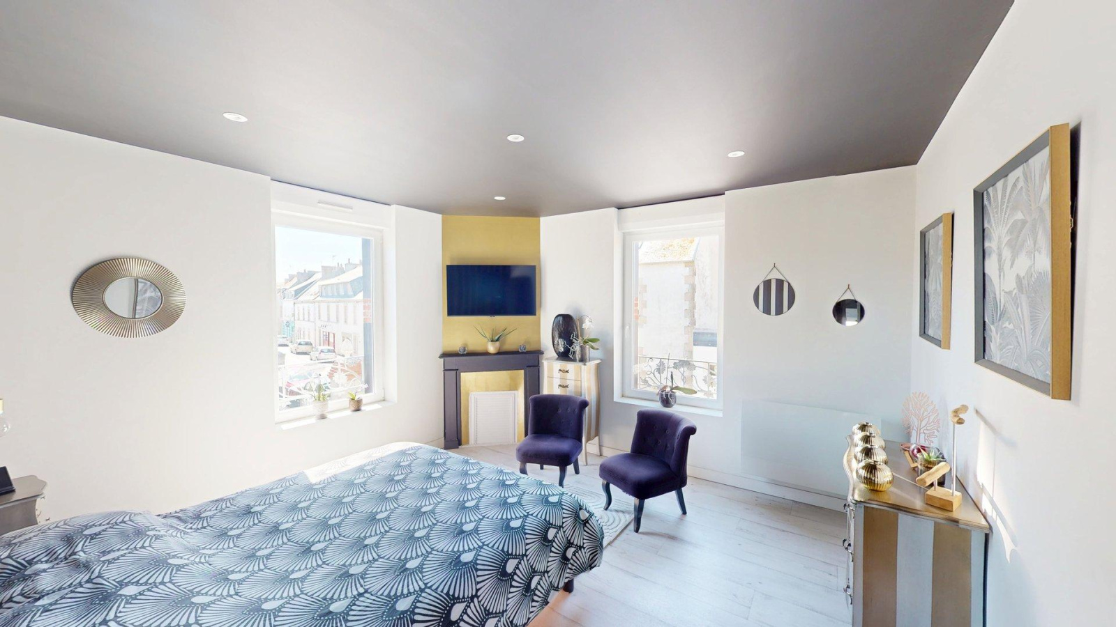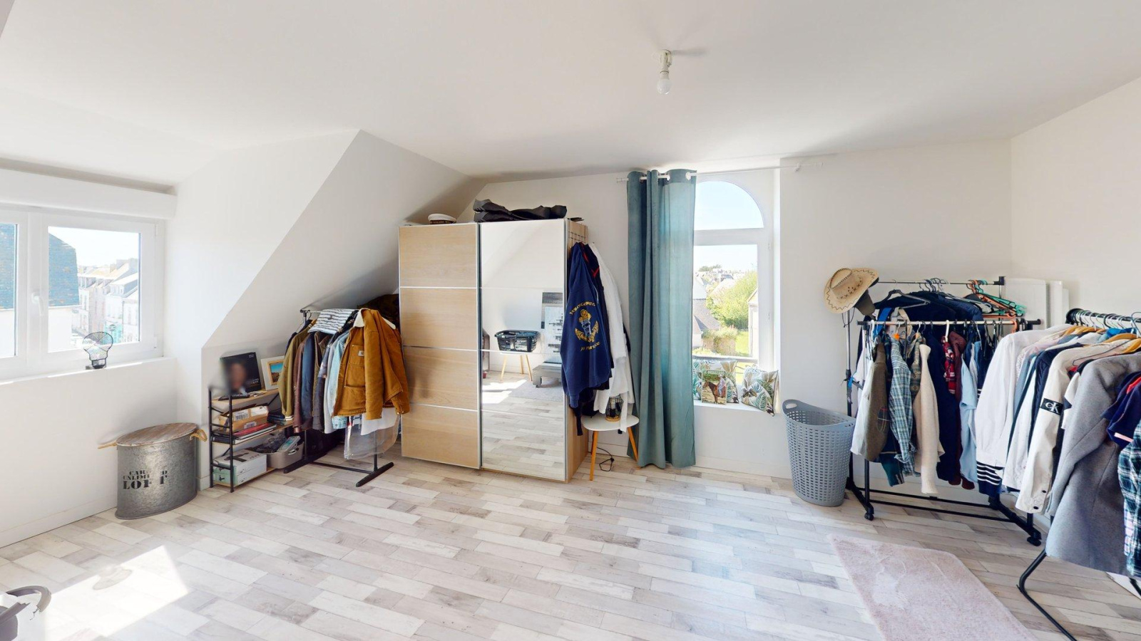 Au 1er étage, vous découvrirez 2 belles chambres confortables, un dressing et une salle d’eau moderne avec WC, offrant à la fois praticité et confort.